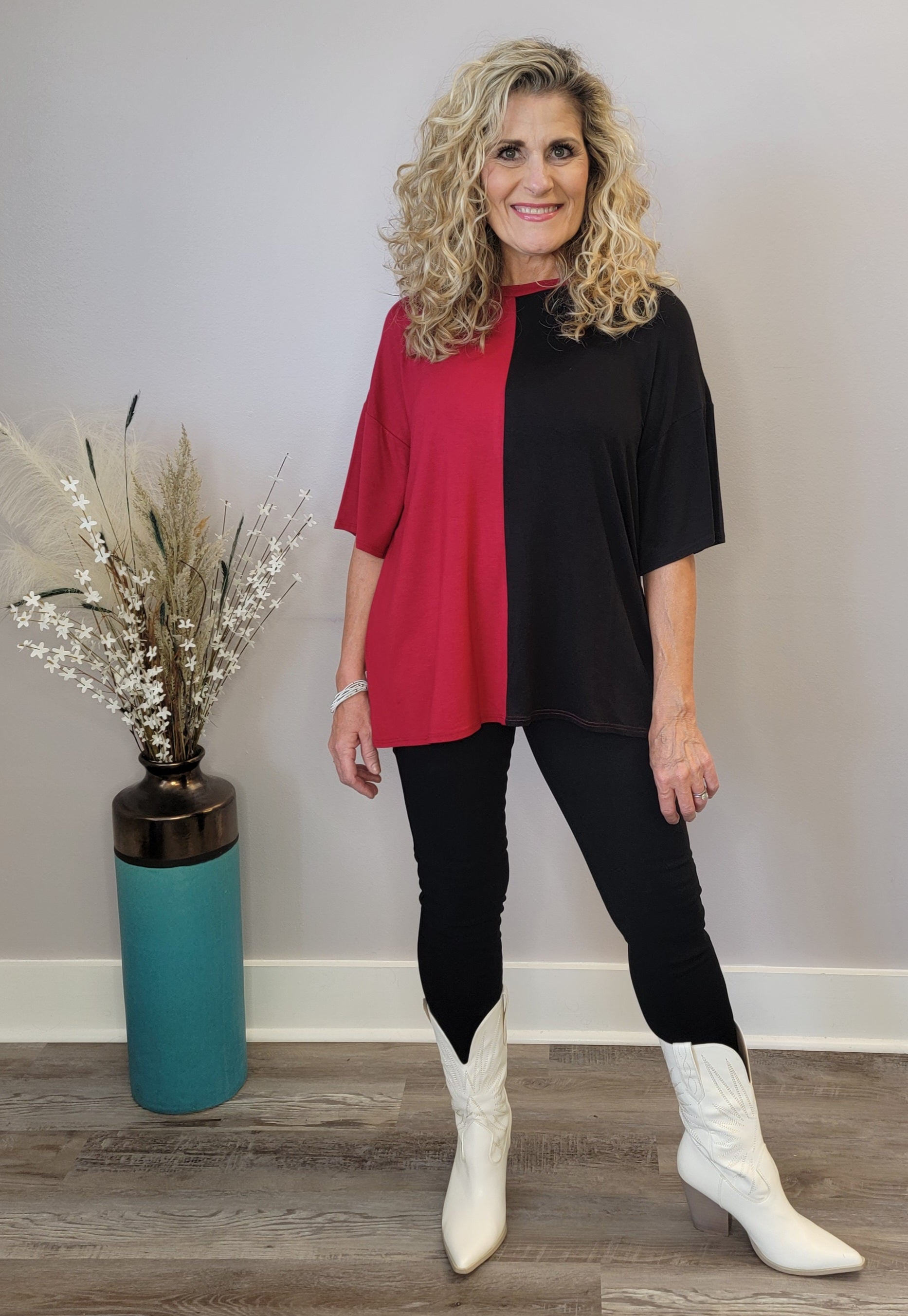 Red & Black color block top. Oversized fit